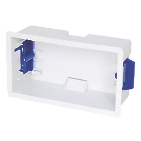 White, plastic dry lining boxes. For mounting electrics into dryline cavity walls.
